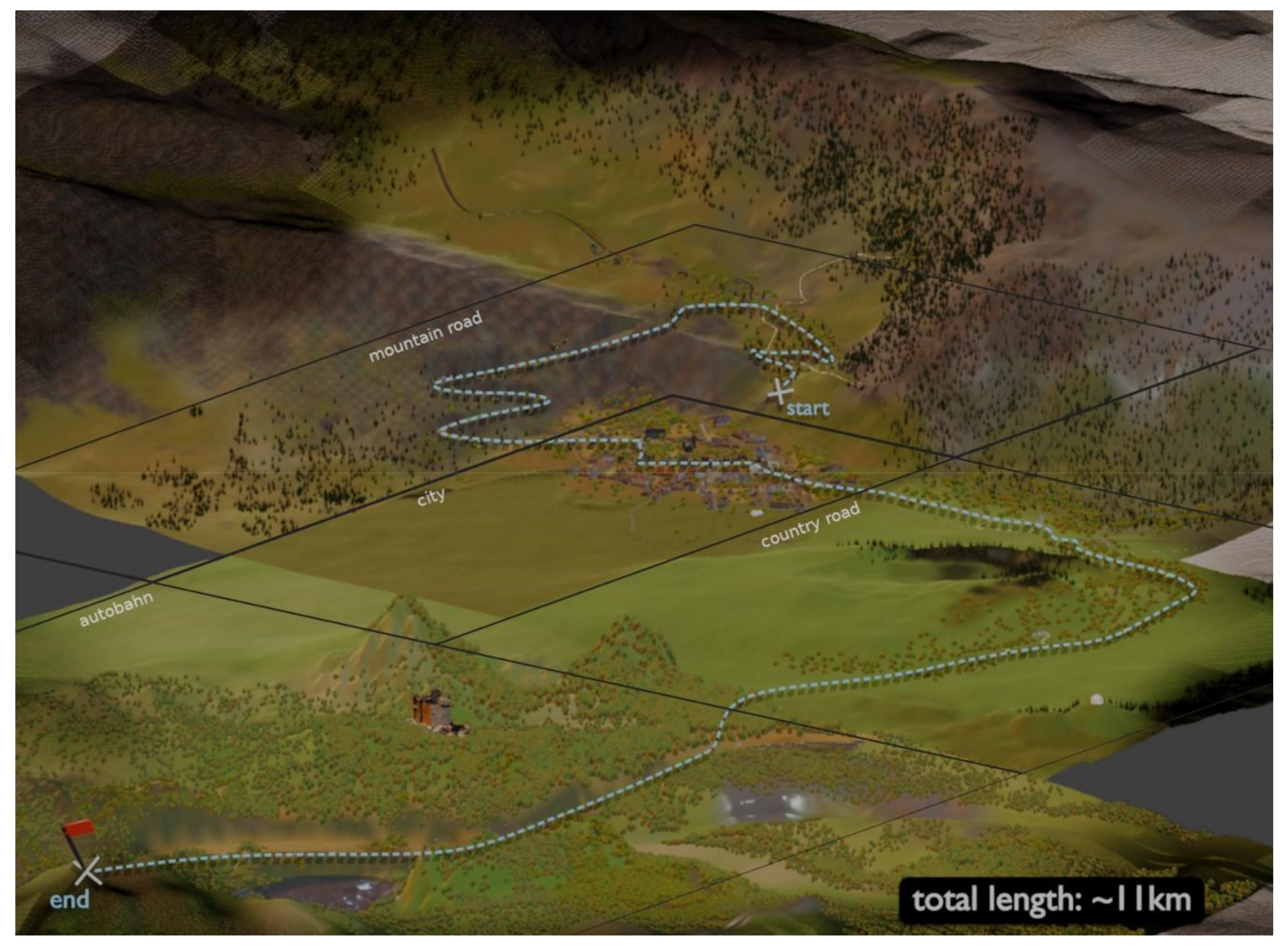 - Terrain: ~25 km², ~11 km continuous drive, four scenes (mountain, city “Westbrück”, country, highway). All derived from OpenStreetMap, cleaned in Blender.