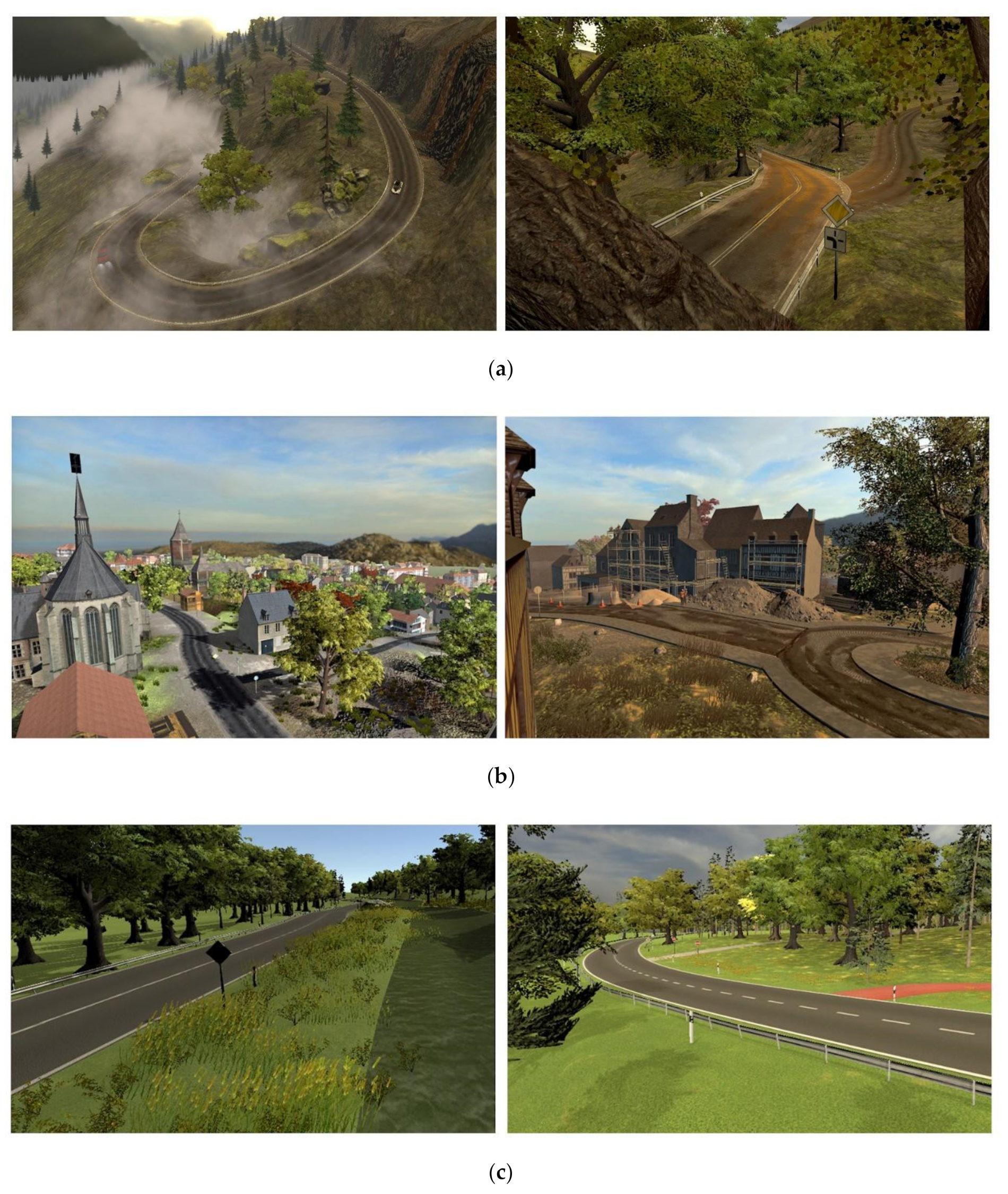 - Population: AI cars (motorbikes, trucks, cars), 125 animated pedestrians, traffic signs compliant with German StVO to keep scene lawful and interpretable. Critical events were designed in consultation with a former German police officer so they reflect typical German accident causes (child/pedestrian, obstacle in lane, vehicle pulling out, landslide/animal on mountain road).