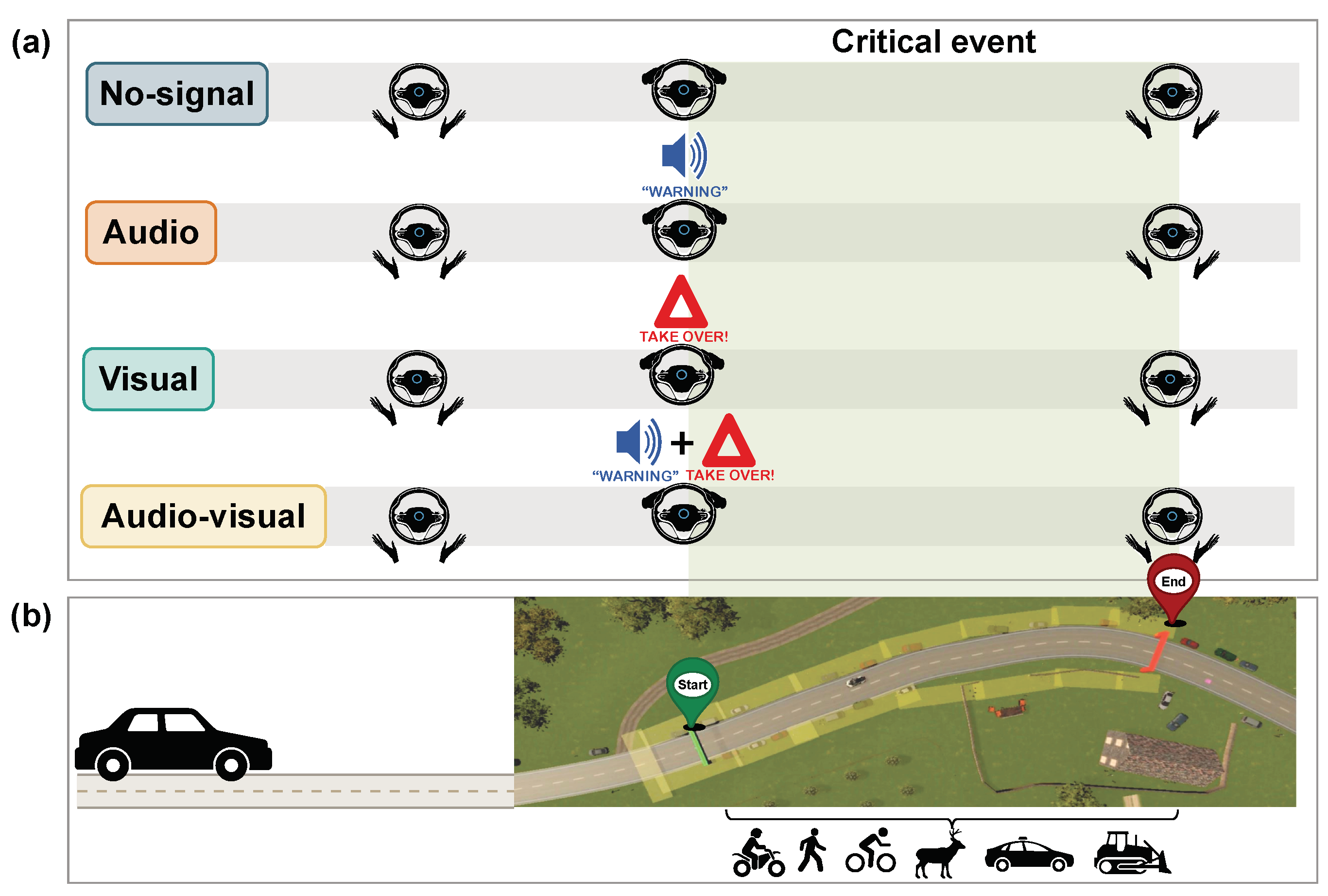 - No signal: vehicle requests takeover but gives no explicit pointer to the hazard → baseline “out of the loop.”